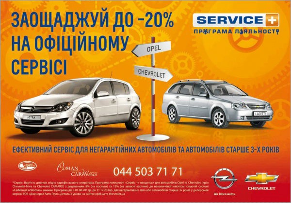 *знижка діє лише за умови обслуговування клієнта і придбання оригінальних з/ч на СТО підприємства через наряд-замовлення під час цього ремонту. Програма лояльності "Сервіс+" вводиться для автомобілів Опель та Шевроле (крім Шевроле Нива та Шевроле Камаро) з додаванням 8% (на послуги) та 13% (на запасні частини) до накопиченої клієнтом в існуючій системі "CarMan&CarWoman" знижки. Програма діє з 01.08.2012 р. до 31.12.2014 р. для негарантійних авто та авто старше 3-х років. Детальні умови на сайтах opel.ua та chevrolet.ua.