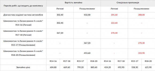 3. Розширений комплекс робіт (шиномонтаж та балансування 4-х коліс та діагностика ходової частини автомобіля) за спеціальною пропозицією: