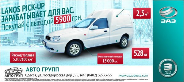 С 24 июля по 31 августа 2014 года в официальный дилерском центре ЗАЗ в Одессе ООО «АВТО ГРУПП», модель ЗАЗ Lanos Pick-Up 2013 г.в. можно приобрести с выгодой до 5 850 грн.