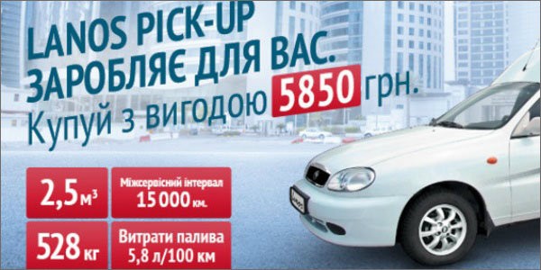 Цена от 97 110 грн.2 и достойные эксплуатационные характеристики Lanos Pick-Up делают его одним из самых популярных фургонов на рынке легкой коммерческой техники. Автомобиль пригоден для использования в ежедневной работе, как частных предпринимателей, так и крупных корпораций. Уже почти 2500 автомобилей модели Lanos Pick-Up стали надежными помощниками своим владельцам.