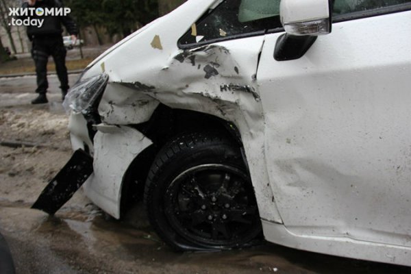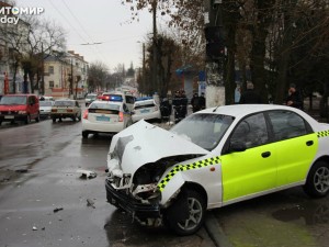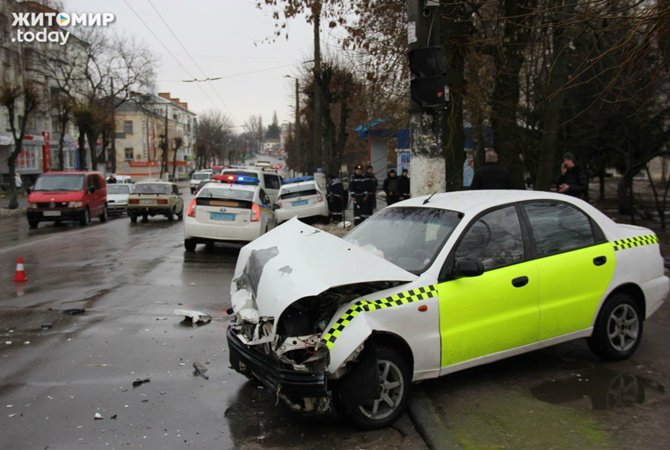 Днем в воскресенье, 31 января, в Житомире полицейский автомобиль Toyota Prius столкнулся с легковушкой Daewoo Lanos службы такси, сбив при этом пешехода, сообщает .
