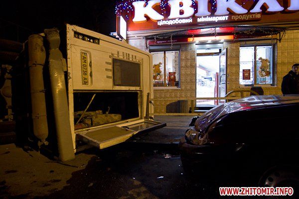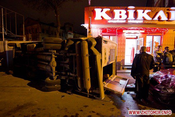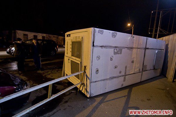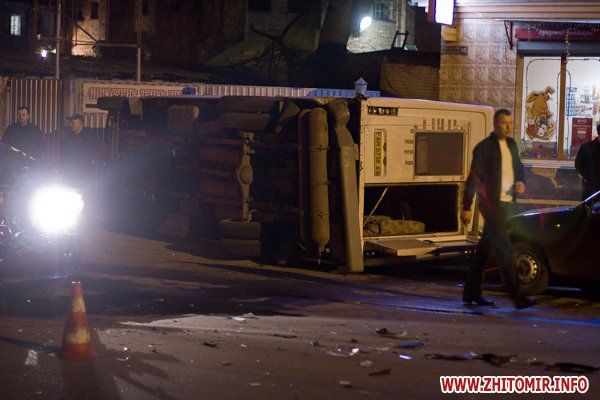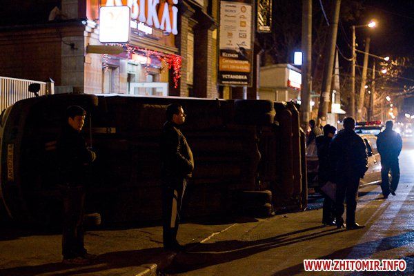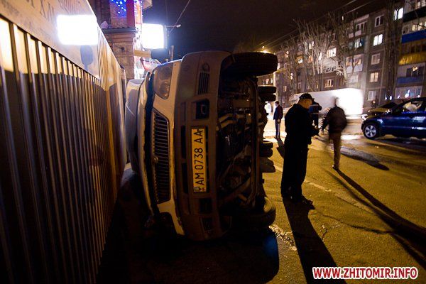 В Житомире, на улице Котовского, столкнулись джип Suzuki и пассажирская маршрутка, при этом «Газель» зацепила припаркованное такси и перевернулась. ДТП случилось 17 апреля, около 21:00, напротив зданий бывшей хмелефабрики, сообщает .