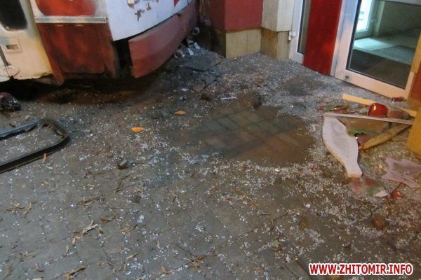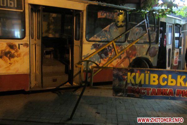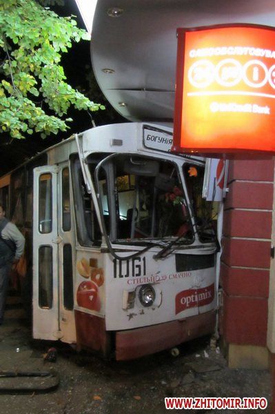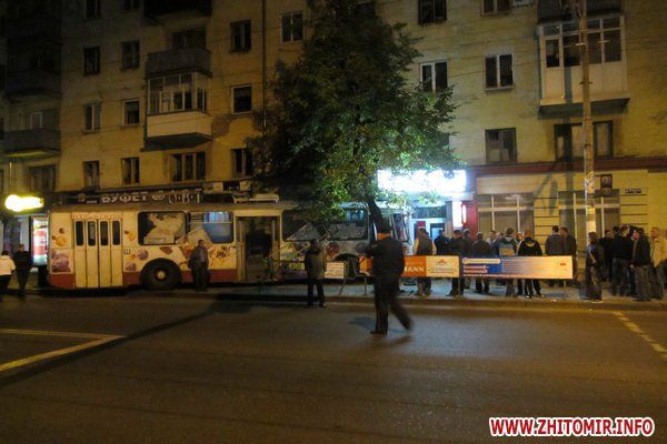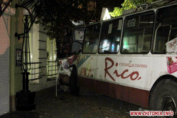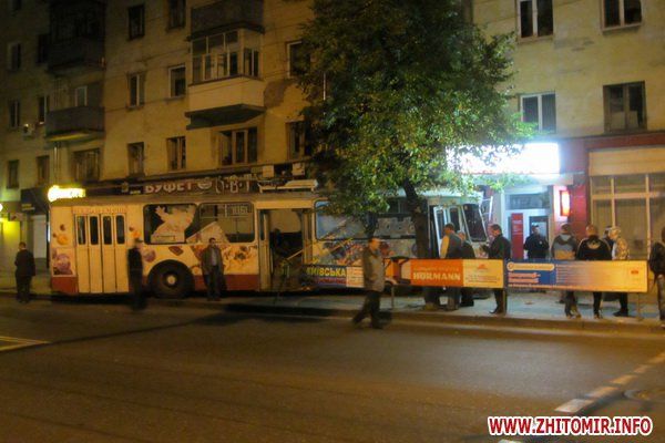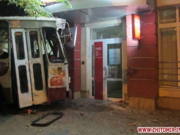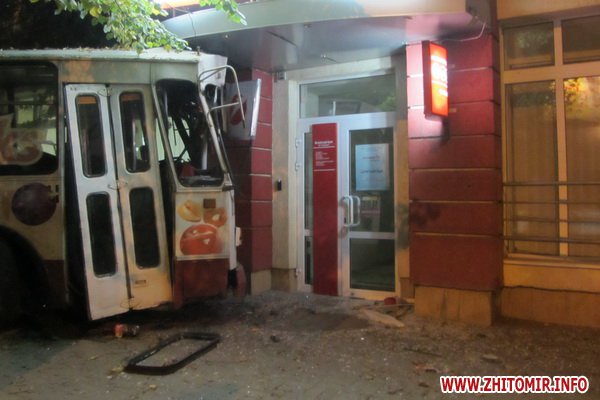 Вчера ночью в здание банка по улице Киевская, 64В в Житомире въехал троллейбус с пассажирами. Сообщается, что троллейбус двигался по ул. Киевской в сторону центра, перед перекрестком с ул. Хлебная внезапно резко повернул влево и въехал в жилой 5-этажный дом, на первом этаже которого находится отделение банка, сообщает .