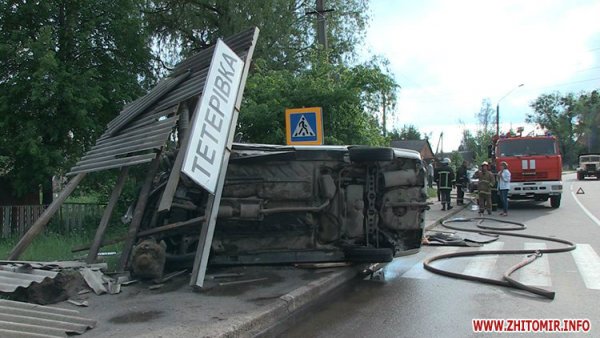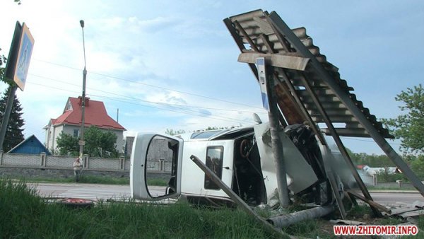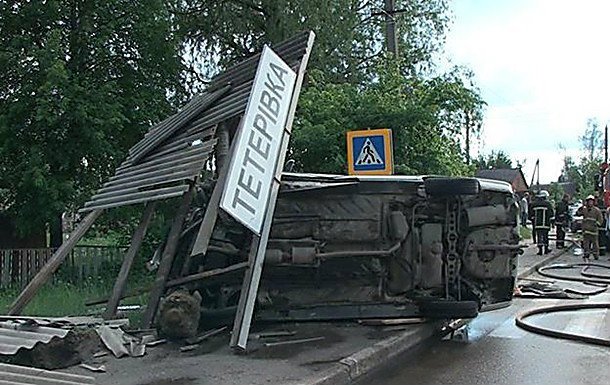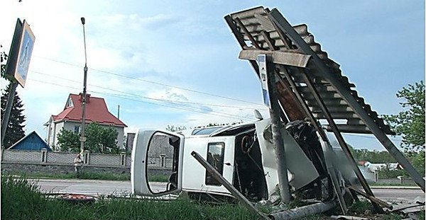 Так, автомобиль сбил двух мужчин, которые на остановке ожидали приезда сельского автобуса. Авария произошла в селе Тетеровке под Житомиром. От удара об остановку автомобиль перекинуло на бок, при этом машина вдребезги разбила железную конструкцию.