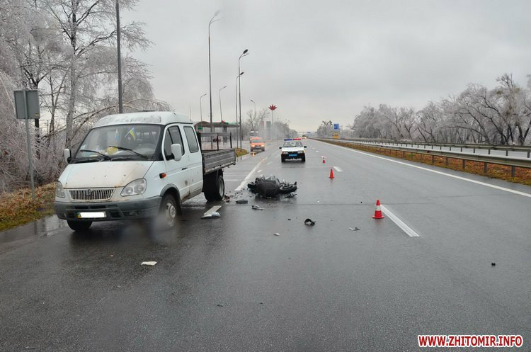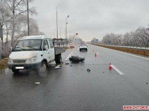 20 ноября около 13:20 на 155 км автодороги Киев-Чоп, в с. Березовка Житомирского района, водитель мотоцикла ШТОРМ, житель Житомирского района, не выбрал безопасную скорость движения и совершил столкновение с автомобилем Газель, под управлением 53-летнего житомирянина, который двигался впереди в попутном направлении.