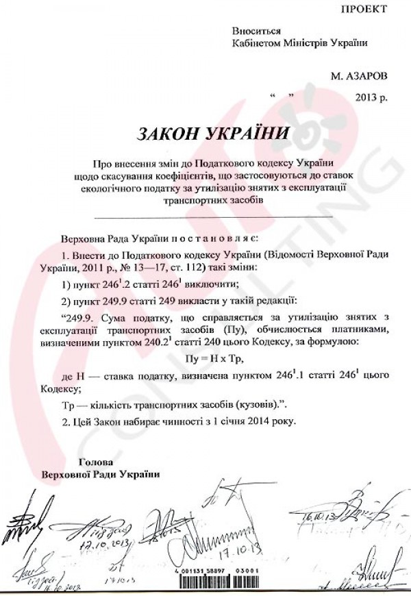 Вот, собственно, и все, что хотят поменять в действующих с 1 сентября 2013 года двух "утилизационных законах" №421-VII "Про утилизацию стятых с эксплуатации транспортных средств" и закон №422-VII "Про внесение изменений в Налоговых Кодекс относительно оплаты экологического налога за утилизацию снятых с эксплуатации транспортных средств...".