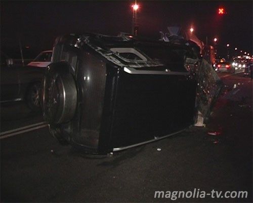 По неизвестным причинам внедорожник стал смещаться левее, пересек левую полосу встречного движения и в средней полосе совершил лобовое столкновение с Toyota. От удара Camry буквально разворотило, а внедорожник опрокинуло на бок.