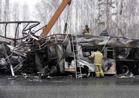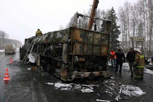 По данным МВД, у грузовика, груженого бытовой техникой, лопнула шина, и он выехал на полосу встречного движения, где и столкнулся с автобусом. Следствие рассматривает несколько версий аварии, в том числе и возможность того, что водитель грузовика уснул за рулем.