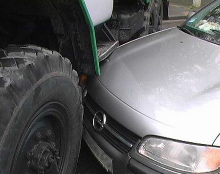 Когда грузовик начал тормозить, он двигался в первом ряду. Его развернуло на 90 градусов, и машина перекрыла первую и вторую полосы движения. В это время во втором ряду двигался "Опель". Хотя водитель резко затормозил, избежать столкновения не удалось.