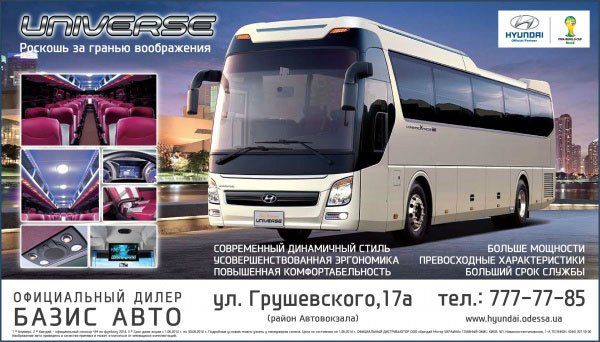 Universe - туристический автобус Hyundai, пришедший на смену зарекомендовавшей себя серии Hyundai Aero. Длительная и тщательная разработка, многочисленные усовершенствования и современные технологии позволили создать по-настоящему комфортабельный, функциональный и долговечный автобус с современным дизайном.