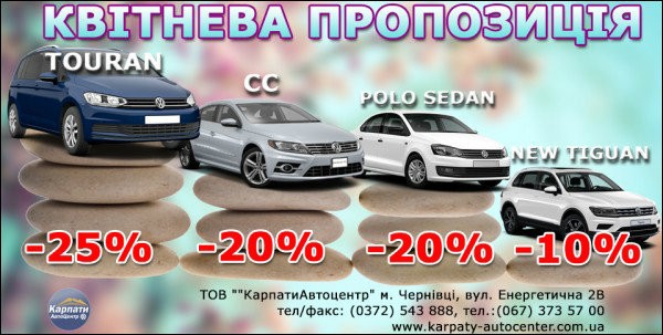 За деталями акційного ціноутворення звертайтеся в автосалон «КарпатиАвтоцентр» за адресою: м. Чернівці вул. Енергетична 2В, або за тел. (0372) 543 888, 050 374 44 55, 096 374 44 55.