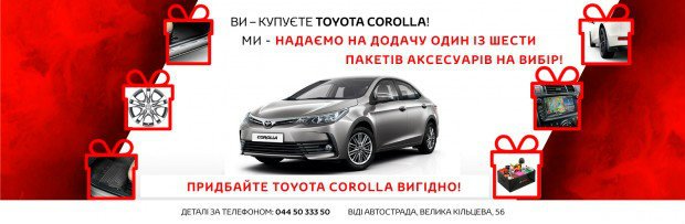 * Під наданням на додачу мається на увазі надання кожному покупцю автомобіля Toyota Corolla одного із шести пакетів аксесуарів на вибір, за умови придбання автомобіля Toyota Corolla у період з 15.08.2018 по 30.09.2018 в автосалоні ТОВ «ВіДі Автострада» за адресою: вул. Велика Кільцева, 56, с. Софіївська Борщагівка, Київська обл., Україна. Зовнішній вигляд товарів, що наведені в рекламі, може відрізнятися від реальних зразків товарів. Зазначена акційна пропозиція  поширюються виключно на фізичних осіб і не може підсумовуватися з іншими акційними пропозиціями і балами за бонусною програмою лояльності VIDI і не нараховується на картки клієнтів. Детальну інформацію уточнюйте, будь ласка, за номерами телефонів: 380445033350 або: 380995033305, аб за адресою: вул. Велика Кільцева, 56, с. Софіївська Борщагівка, Київська обл., Україна.