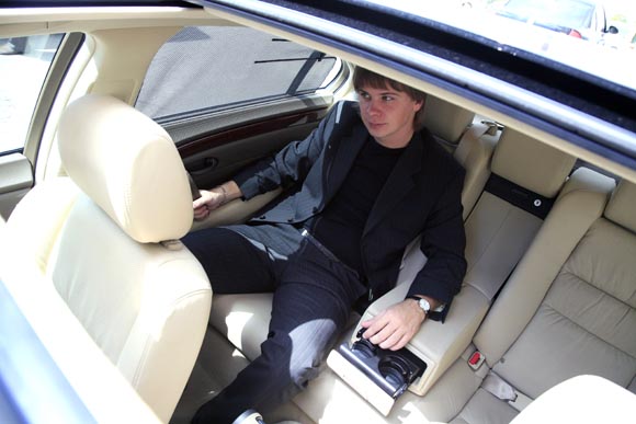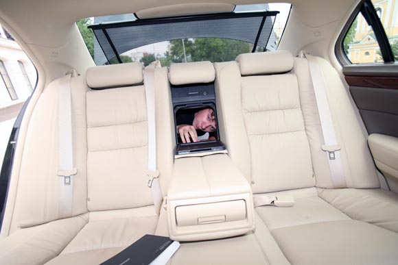 Перебираемся на задний диван. Троим можно поместиться, но будет неудобно — посредине небольшая «возвышенность». Зато двое VIP-пассажиров устроятся по-королевски. Если ваш рост меньше двух метров, а фамилия не Кличко, колени никуда не упрутся. Два задних места разделяет удобный подлокотник, из которого по первому требованию появятся подстаканники. Естественно, предусмотрено отдельное управление воздуховодами климат-контроля. В двери вмонтированы солнцезащитные шторки. А шторка заднего стекла активируется нажатием кнопки возле люка. Рядом есть другая интересная кнопка, она опускает задние подголовники, если те мешают обзору.